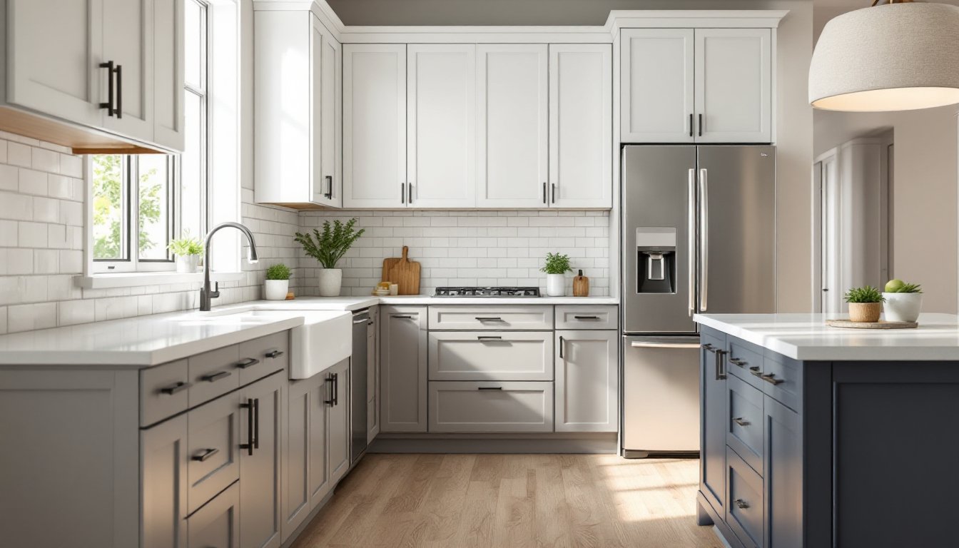Two tone cabinetry, especially the grey-and-white combo, has shifted from trend to staple in kitchen design. It breaks up visual